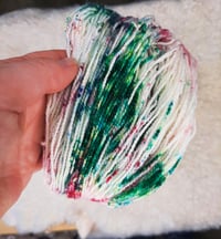 Ribbon Candy is a wonderfully fun speckled colorway. This color is reminiscent of the colorful timeless treat of ribbon candy. With blue, yellow, green and red speckles. This is a classic Holiday colorway that will complement a myriad of projects.